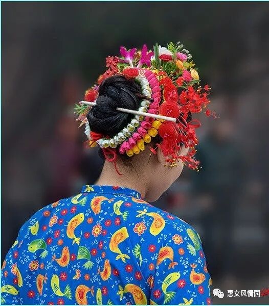 蟳蜅女的头饰比衣着更具特色,有“头上的花园”美称。结婚的妇女将头发梳好盘在脑后,绾成一个,再横着插上发簪,把一串串鲜花串成花环,将发簪装饰起来,色彩绚丽美观,展现了浔埔人的朴素美与对生活的热爱。
