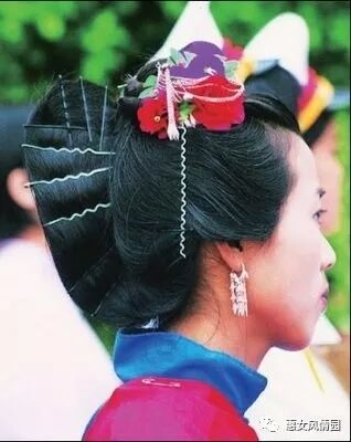 后者也蒙上头巾,但头巾上缀有红色小花蕾,中青年妇女多把双辫子折在头顶的两侧,包上头巾似有梭角的感觉。