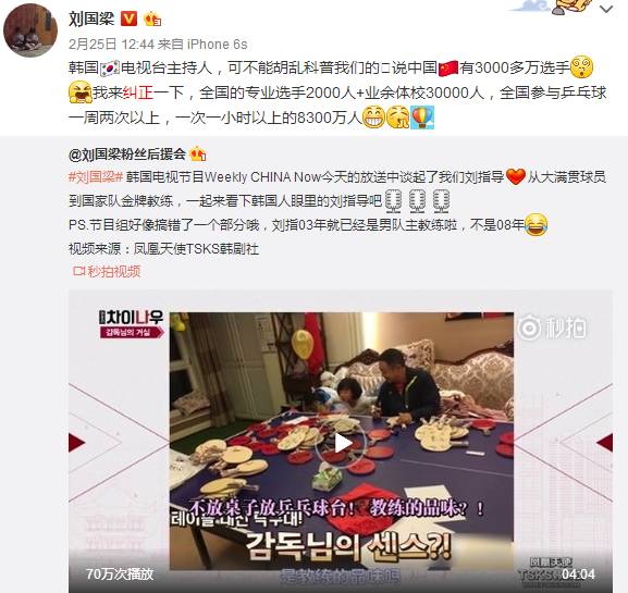 刘国梁转发了有关韩媒报道他的微博,并说:“韩国电视台主持人,可不能胡乱科普说我们中国有3000多万选手。我来纠正一下,全国的专业选手2000人