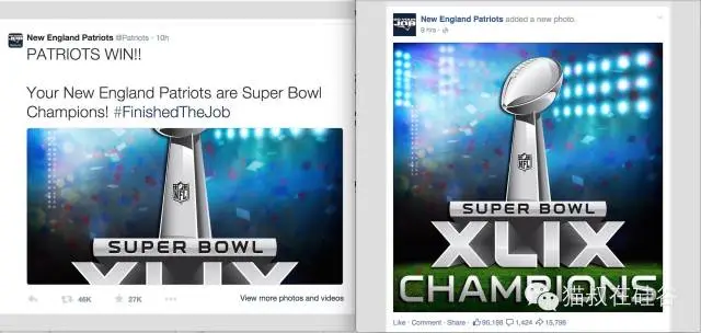 美国白宫在赛后也第一时间通过Twitter平台恭喜了胜利者爱国者队,而压根没有在Facebook上发过超级碗内容。爱国者队在Twitter上发布的内容无论是时间先后还是信息数量都明显高于Facebook。在赛后宣布胜利的同一内容上,Twitter内容获得了4.6万次转发和2.7万次点赞,而Facebook上的内容则获得了1.5万次转发和9万次点赞。