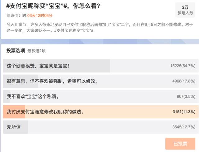 36氪昨天在微博上发起一个调查,截至目前已有两万人投票,投票结果令我大开眼界。54.7%的人认为“这个创意很赞,宝宝就是宝宝”,17.8%的人认为“很有意思,但不喜欢被强制,希望可以修改”,只有11.3%的人“讨厌支付宝随意修改我昵称的做法”,另有3.5%的人“不喜欢宝宝这个称谓”,12.7%的人“无所谓”。