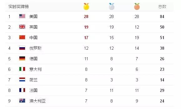 而在总成绩榜上,中国目前以17金排在美国(28金)、英国(19金)之后,总奖牌数也仅比英国多一枚。更要命的是,后续项目并非强项,添砖加瓦乏力。不出特大意外的话,这将是近五届奥运会中成绩最差的一届。