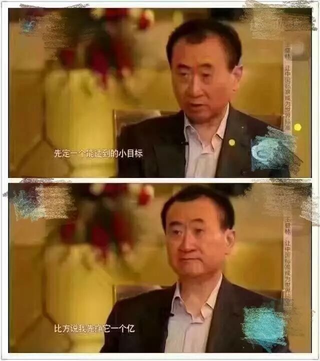 这是在某电视节目中,主持人对王健林的一个访谈,聊着聊着就聊到教年轻人怎样成为中国首富。王健林说:“很多年轻人,有自己目标,比如想做首富是对的,奋斗的方向,但是最好先定一个小目标,比方说我先挣它一个亿。你看看能用几年挣到一个亿。你是规划五年还是三年。到了以后,下一个目标,再奔10亿,100亿。”