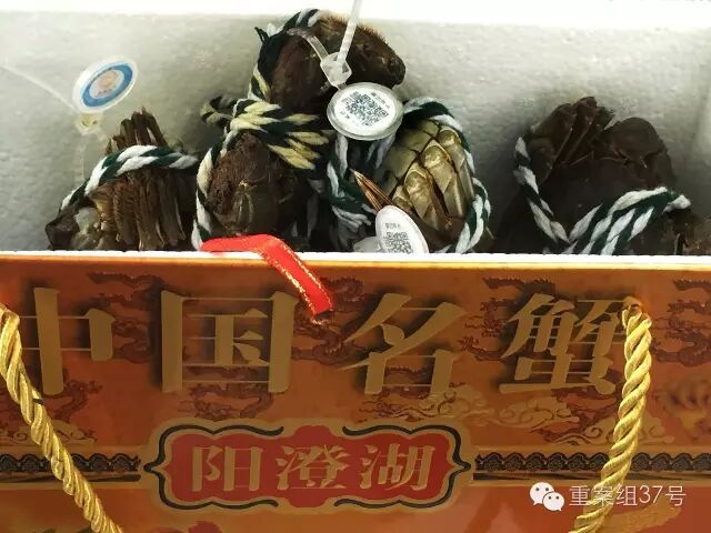 随后,重案组37号探员购买了10只25元一只的“阳澄湖大闸蟹”,店主将螃蟹挑出后,随即走出店外,两分钟后,店主回来手上拿着一个写有“阳澄湖大闸蟹”字样的礼盒。店内两名男性员工熟练地将螃蟹捆绑,并将每一只套上“防伪蟹扣”。五分钟后,一份精美的十只装的阳澄湖大闸蟹礼盒便出现在了探员眼前。