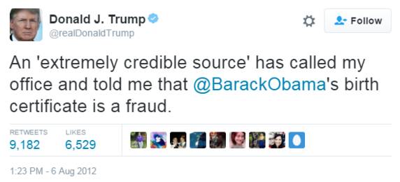 而特朗普早年也是奥巴马出生证明系造假的铁杆支持者。他2012年就发了条推特质疑: