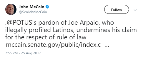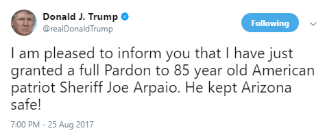 我很高兴告诉大家,我刚刚特赦了一位85岁的美国爱国警长——乔·阿帕约。他让亚利桑那州更安全!