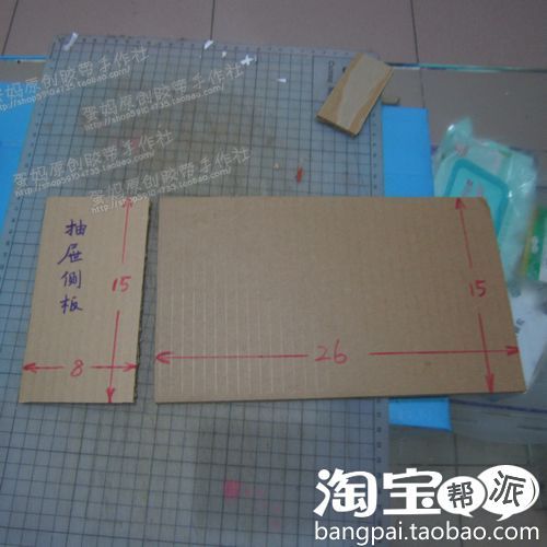 23、裁一块和上下面板一样大的纸板,用做两个抽屉套之间的夹层。