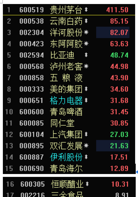 从市值和股价来看,最高的贵州茅台。这18家“超级品牌”,主要涵盖在医药制造、食品饮料 、汽车 、家电 、酿酒