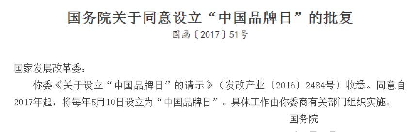 日前,国务院印发《关于同意设立“中国品牌日”的批复》,同意自2017年起,将每年5月10日设立为“中国品牌日”。