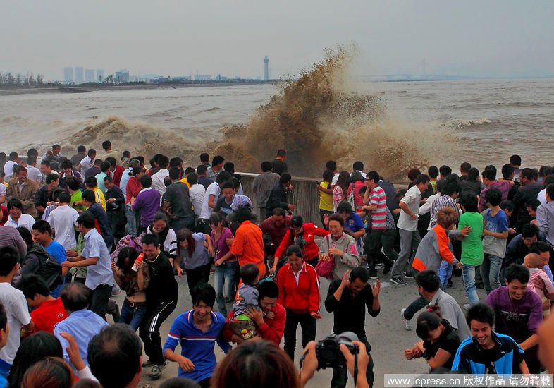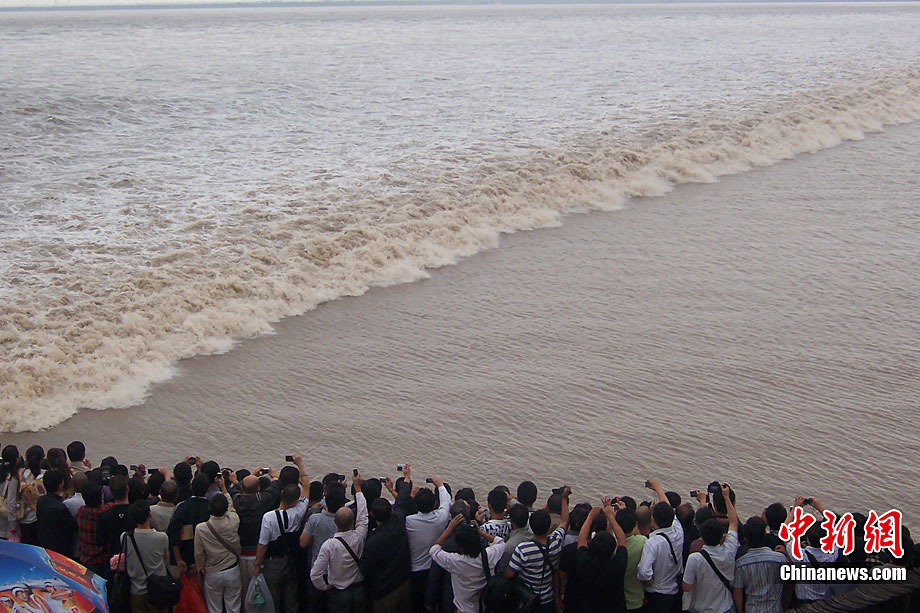 其二,江口有巨大的拦门沙坎,潮水涌进遇到强大阻力,潮头自然会受遏向上。前浪遭遏,后浪又上,波推波,浪迭浪,潮水自然奔腾咆哮,排山倒海般汹涌而来。潮头高度可达3.5米以上,潮差可达10米。