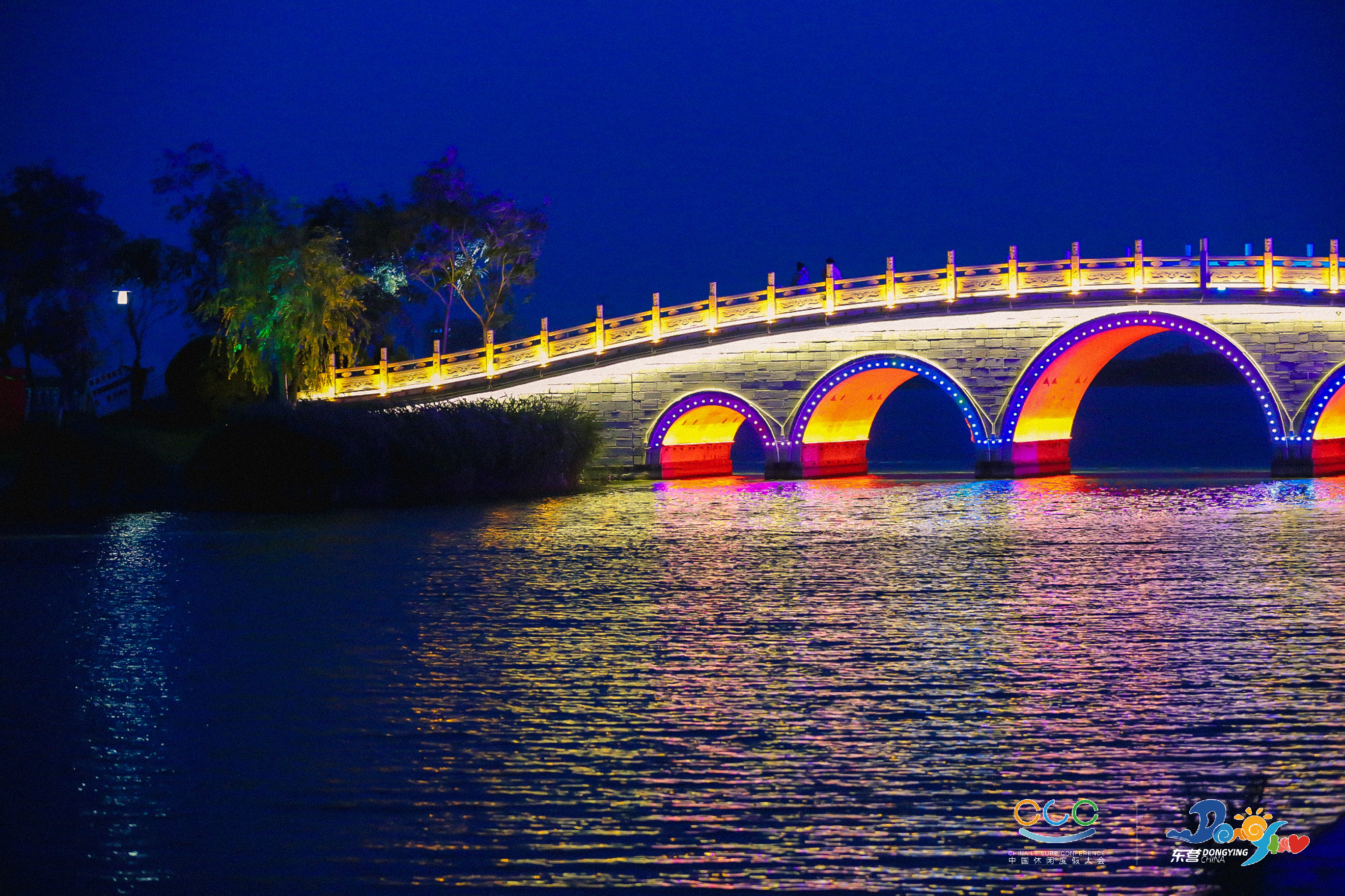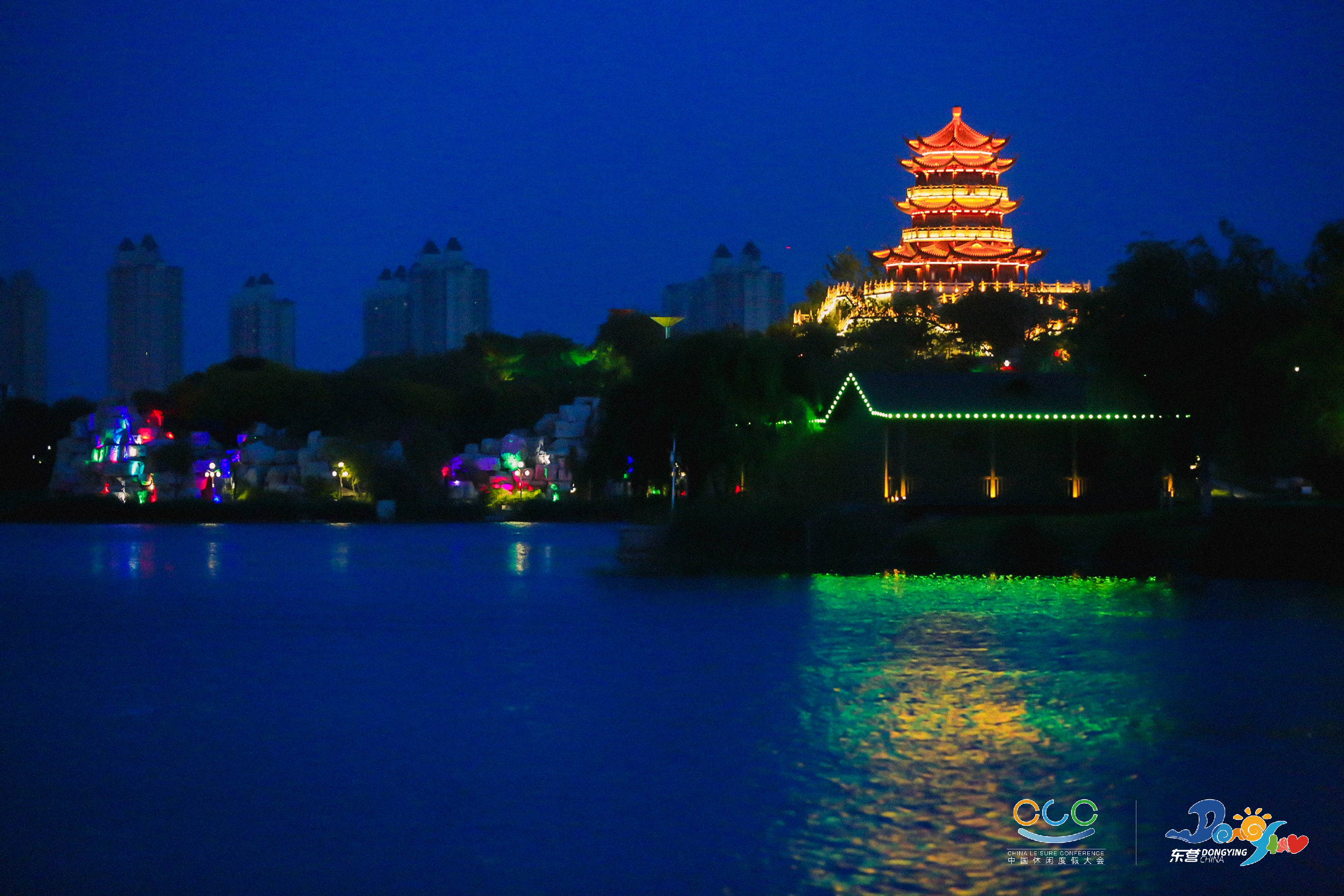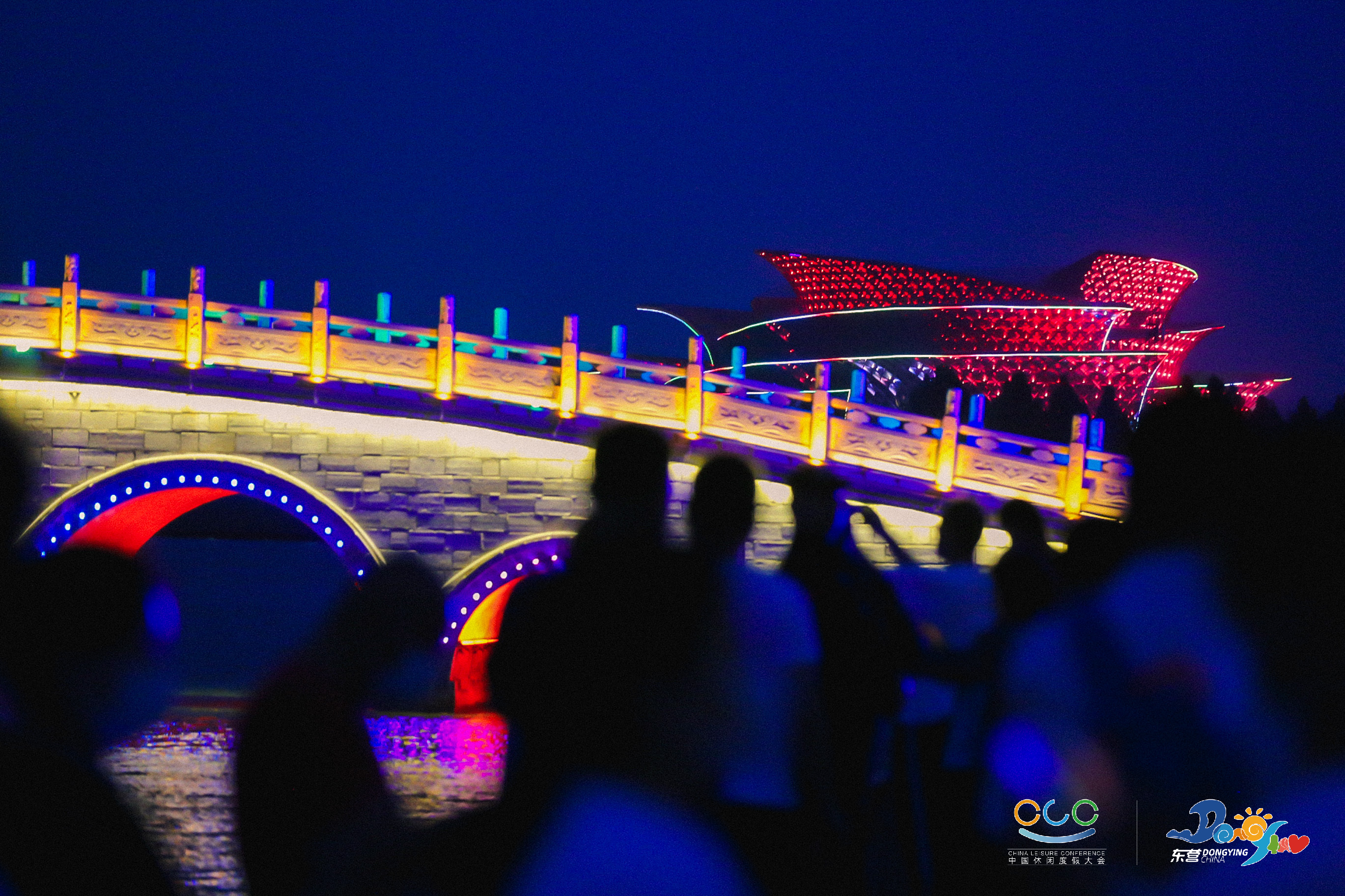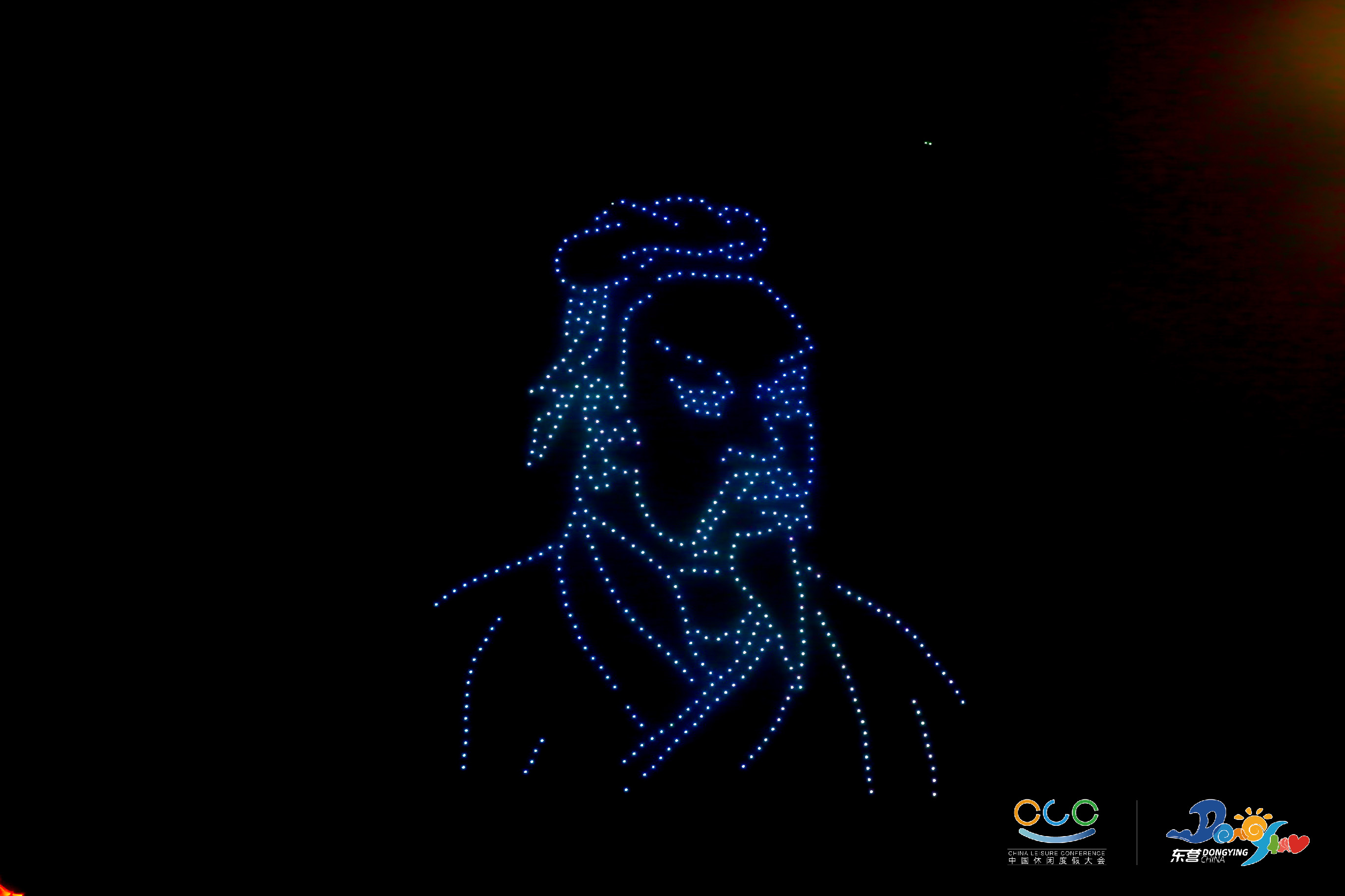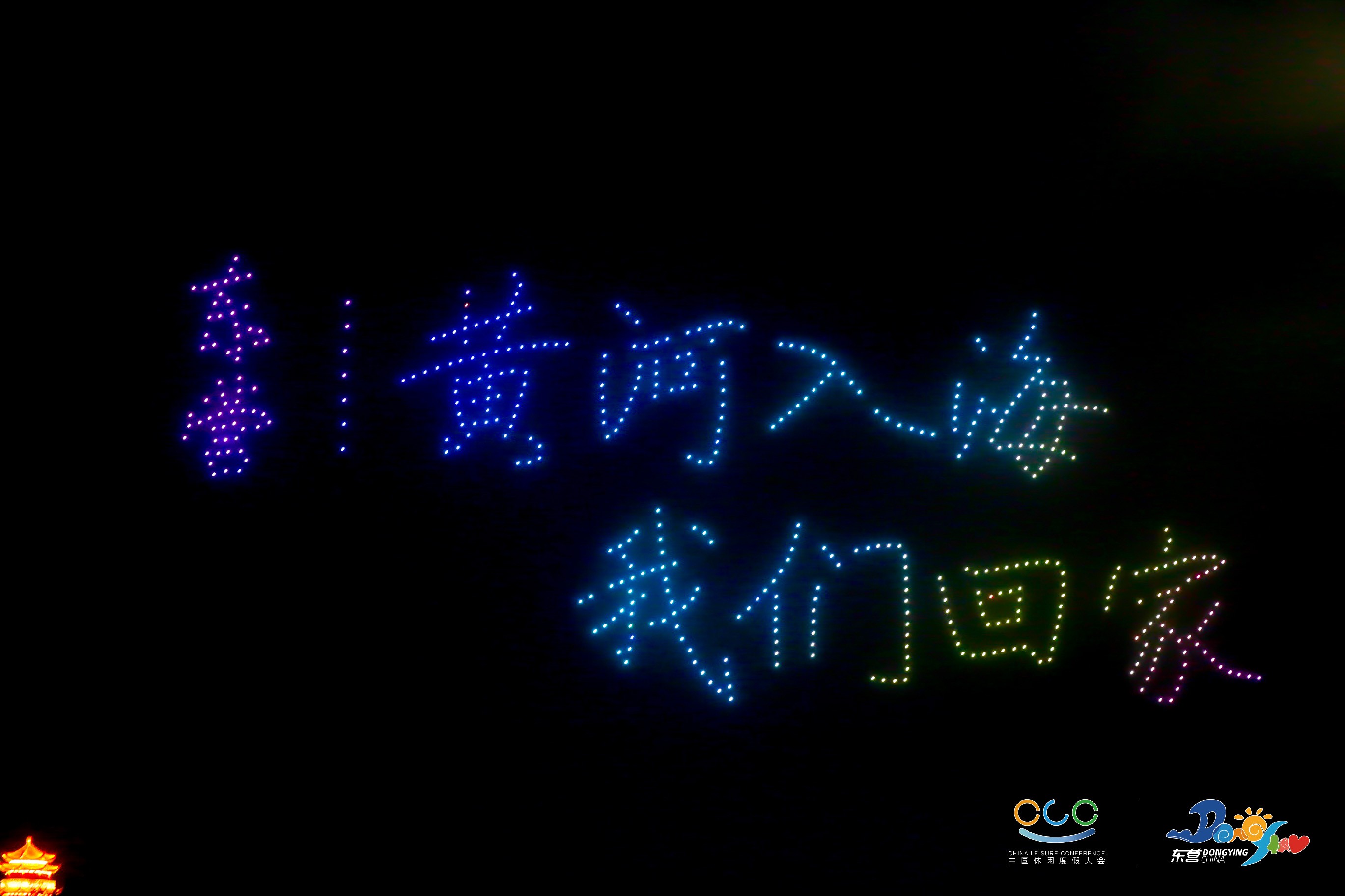 在2021中国休闲度假大会期间的清风湖休闲之夜,500架无人机,盘旋于清风湖上,在律动的蓝色、红色和黄色中来回置换、抽离、重组,打造出精美绝伦的9幅画面,带着璀璨灯光绽放全城,展现东营独特的文化标志,带给市民一场炫酷浪漫的顶级视觉盛宴。
