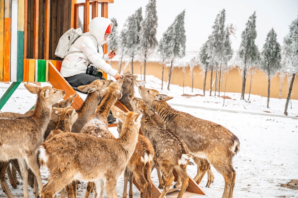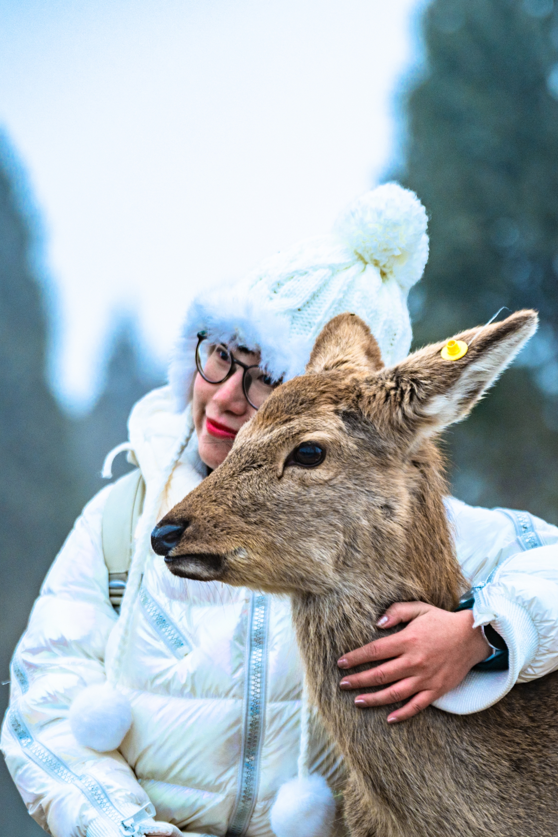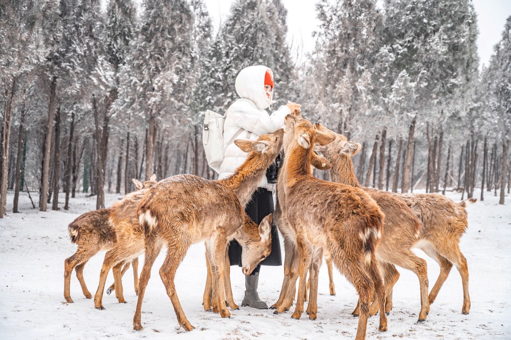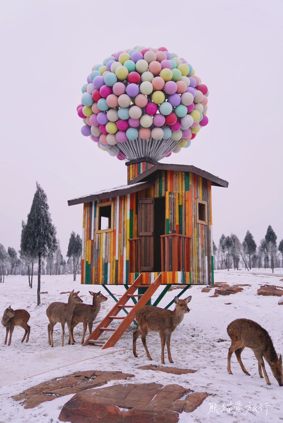 倘若雪后来小鹿森林,场景更梦幻,仿佛每一幕都是童话场景,在小鹿森林中间,有一个飞屋环游记里的装点满彩色气球的飞屋,坐在飞屋前,用一包鹿饼就可以召唤一群小鹿,在这里可以拍出特别浪漫的照片!