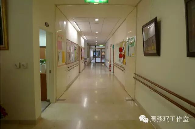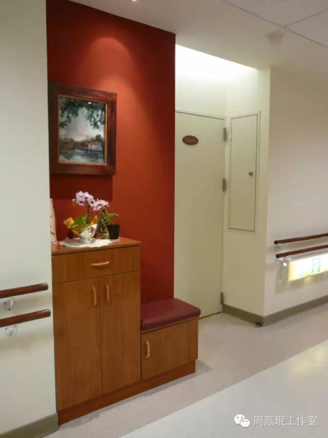 小小缺憾:调研中注意到,一些室内设计比较考究的养老机构通常有着一整套的VI体系(即:视觉识别系统),其色彩配置在和谐雅致方面做得很不错。但有时仅仅关注了色彩的“统一性”,对长期住在里面的老人而言却缺少了一些变化和趣味性;而对偶尔来参观的访客或来探视老人的亲友来说,空间给其留下的印象可能也不深刻。