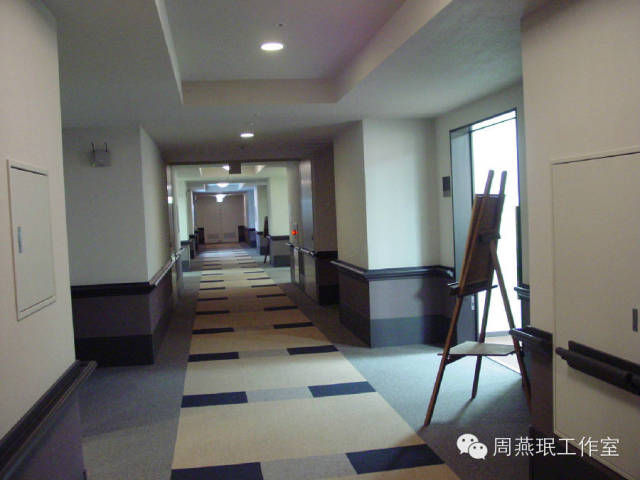 小小缺憾:某养老院长长的公共走廊中墙面和地面的色彩过于接近(图7),又没有家具可供衬托和对比,视觉退化的老年人往往难以辨识墙地面的交界线,对空间的感受是比较混沌的,长此以往也容易对老人心理带来负面影响。