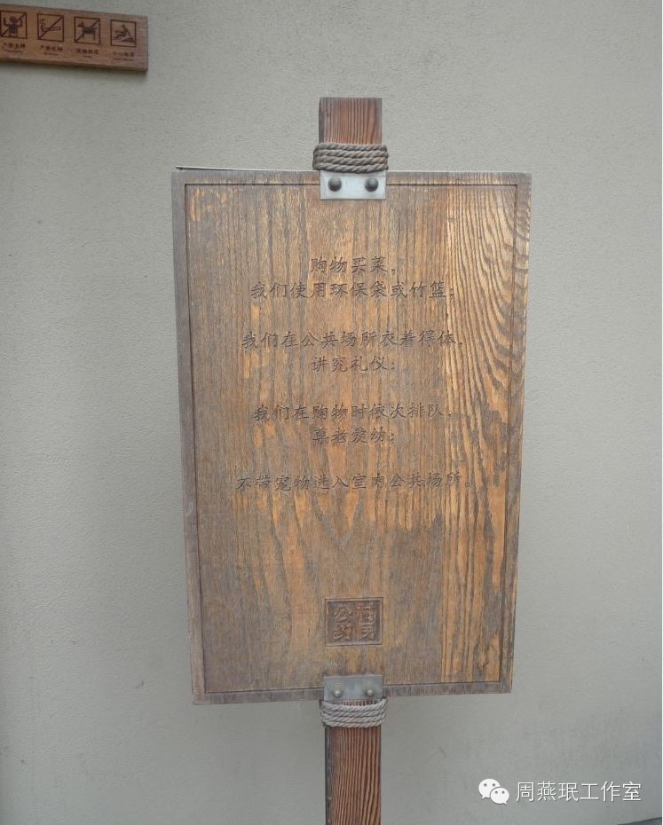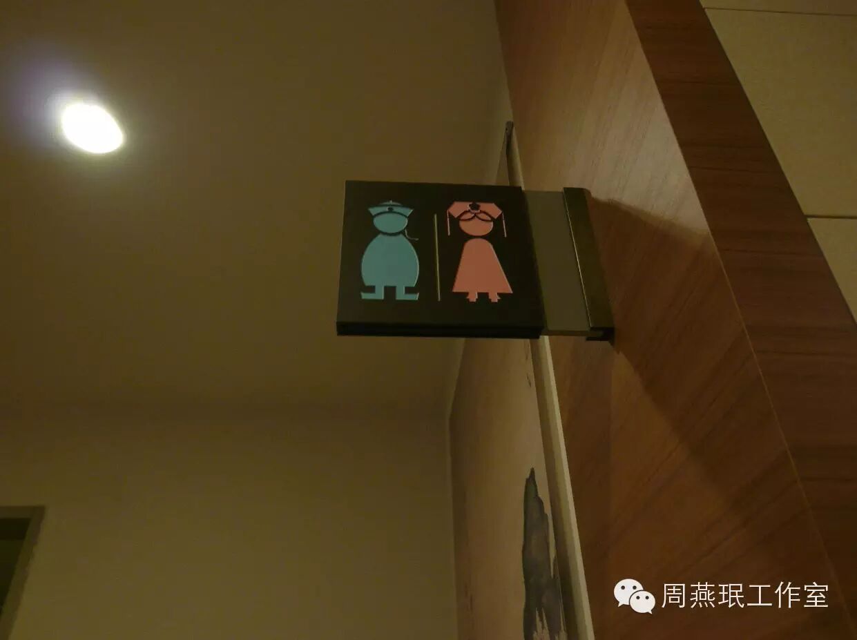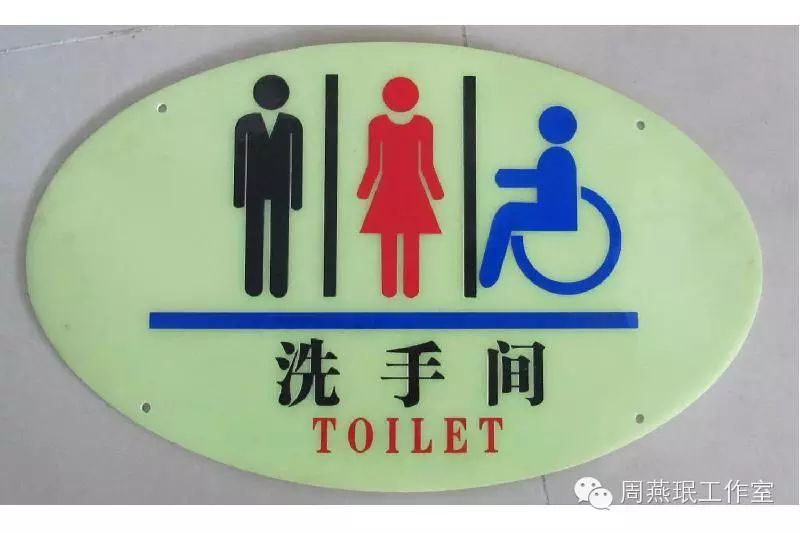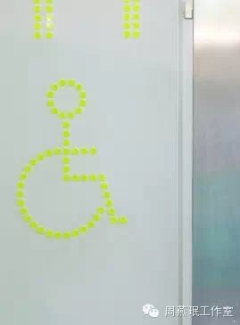 小小缺憾:一些标识设计人员虽然进行了创新,但由于未能充分考虑到老年人视觉精细辨别能力下降等因素,采用了不适宜的设计手法和设计元素,造成标识信息不易被老年人识别。例如为了显示与常规设计手法有所差异,选用纤细而间断的点状线组成图案,且图案与背景的色彩对比度较小(图5),结果这些因素却增加了老年人辨别标识内容的难度。