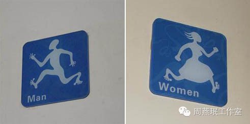 设计妙招:设计时可采用色块元素来表现标识图案,尺寸适宜的色块更有利于老年人辨识。还可适当采用一些符合大众认知、约定俗成的色彩搭配,例如以红色、粉红色代表女性,以蓝色代表男性(图6)。对于一些需要悬挂在高处或以较远距离观看的标识牌,还应适当增加图底色彩的对比度。这样,老人即便看不清标识的具体细部,也能够通过色彩获得有效信息。