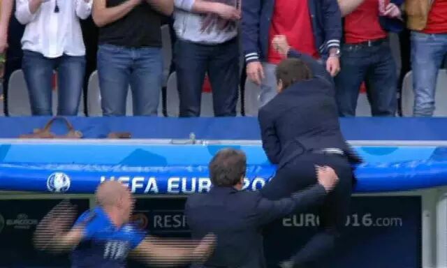 打败西班牙,孔蒂像个疯子一样在场边跳跃着,和球员、助教们拥抱。他像温网夺冠的网球手一样,抓住入场通道顶篷,似乎要往上爬,实在爬不上去了,这才作罢,恢复地面的跳跃。