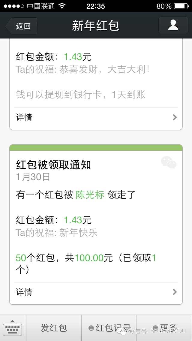 微信流传陈光标在大年三十晚上会发出2000万的红包,前提是大家都把这个ID添加到自己所在的群里,他才能给这些群派发红包,好多人把这ID加群里了。然后陈光标自己并没有派发红包而是闷头抢了每个群里其他人发的大批红包……