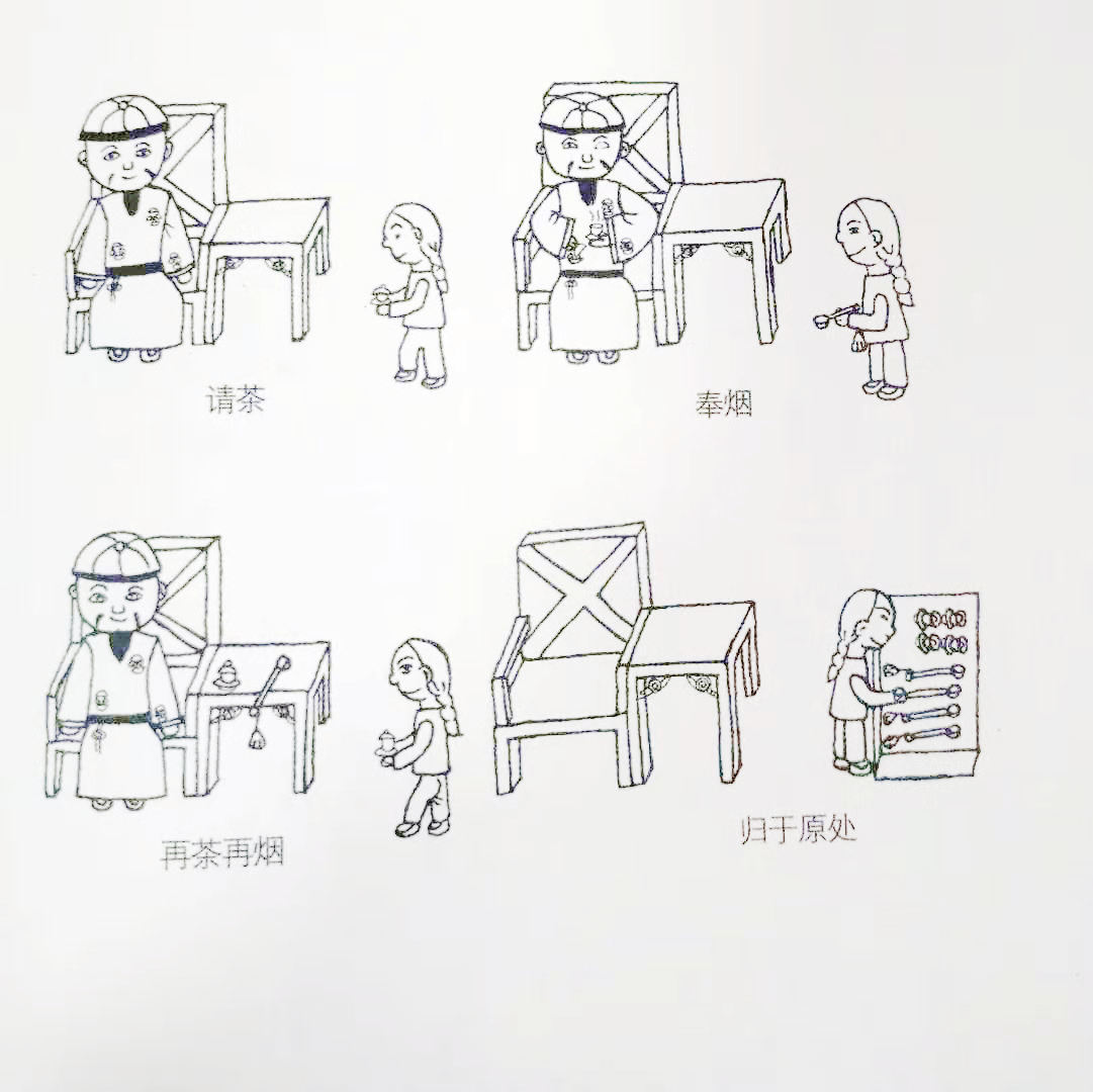 明清时期晋商供学徒启蒙的小书《贸易须知》也有关于给客人斟茶的描述:“客到,俟客坐定,即斟茶。双手之请茶奉过,退两步,再回头走;茶吃过,即奉烟、请烟;如客坐多时,再茶再烟。客去即将茶盅、烟盘归于原处,不可东搭西掼。”简单几句话,便将学徒(店员)怎么样端茶待客说得清清楚楚。