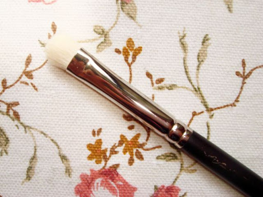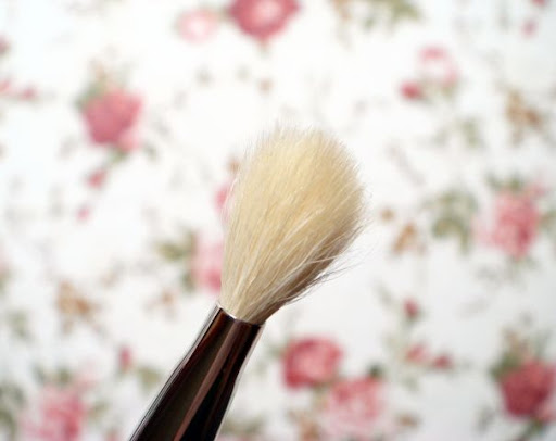 扁平的刷头用于附着颜色,个人认为此刷也可以用作边界晕染,做到一刷多用的效果。毛量适中,抓粉力适中。白色的刷毛总是让人很有爱,可以清晰地看到粘粉量~!可以很好的把颜色压在想要的范围内,推荐少量多次的手法。对于眼部化妆刷来说,我认为这把是个必备品~!可以看到我用这把用的比较多,刷杆子上面的logo已经都模糊不清了~!