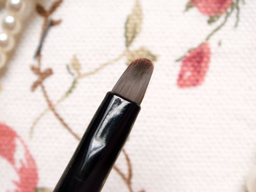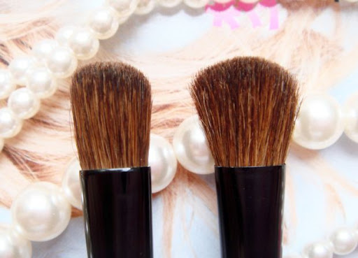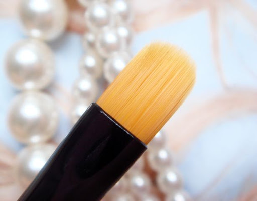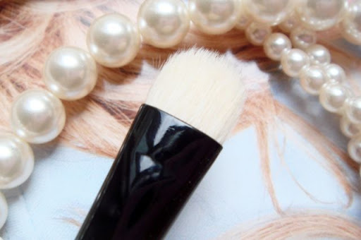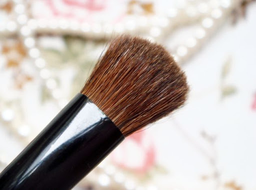 这把刷子一般情况下是用来眼部打底的,可以大面积的横扫,刷毛很软,抓粉力适中。因为刷头是扁形的,所以有横竖两个面,可以随意调节宽窄来覆盖上色。作为一把眼部打底刷,它还是蛮能够上任的。