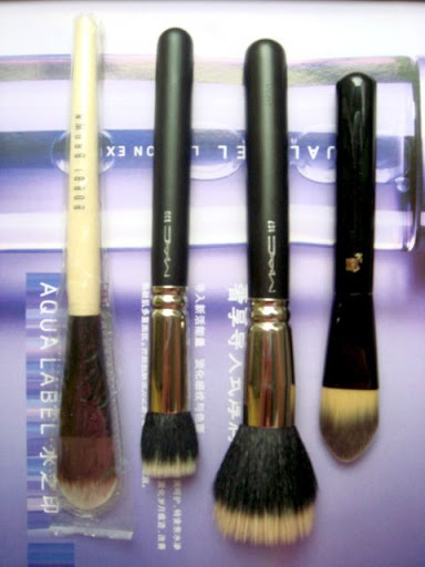 这四把刷子是我目前的粉底刷,从左到右依次是: BB粉底刷,MAC130#,MAC187#,兰蔻粉底刷。