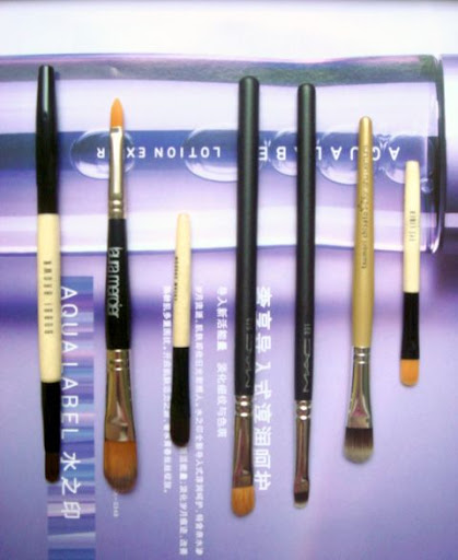 从左到右依次是:BB遮瑕刷,Laura Mercier双头遮瑕刷,BB眼影膏刷,MAC224#,MAC231#,植村秀,BB眼线刷。