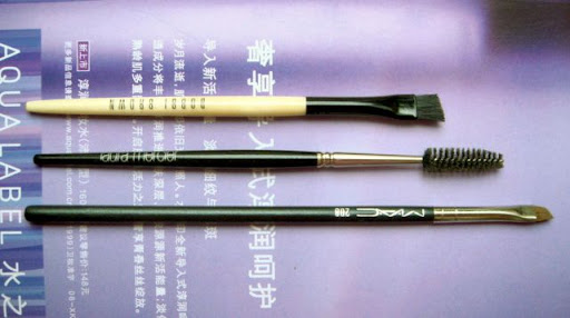 这是我的必备眉刷工具。从左到右依次是:BB眉刷,Laura Mercier眉刷/睫毛刷,MAC208#眉刷。