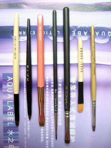 这些刷子都可以拿来画眼线用。从左到右依次是:BB的眼线(胶)刷,KATE眼线刷,白风堂,MAC210#, MAC231#,