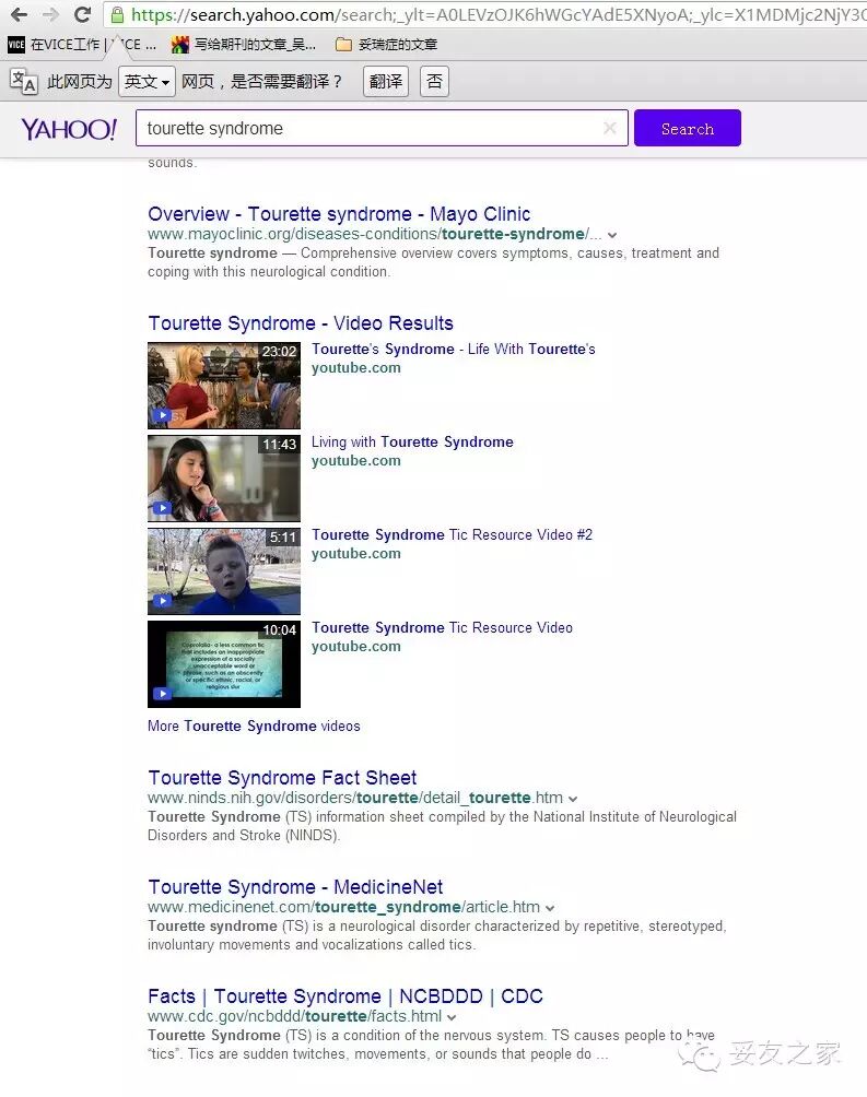 回到yahoo给出的答案的页面,看到的绝大多数都是非营利机构和医学机构给出关于妥瑞症的客观,全面,且有着数据支持的文章并且还列出了被我们官方封闭的YouTube上面的外国人拍的关于妥瑞症的励志视频。