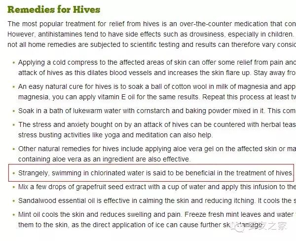 到今天为止,我没吃任何药物。身上的风疹已经几乎消失。而这个关于风疹自救疗法里面其中里面红线框住的部分说在氯化消毒过的水中游泳对治愈风疹有极大的辅助作用。而大蒋有游泳的习惯,昨天刚好游一个小时的泳,而所在的泳池的水的确是经过氯化消毒的。所以这算是我用英语帮助我自己诊病了。