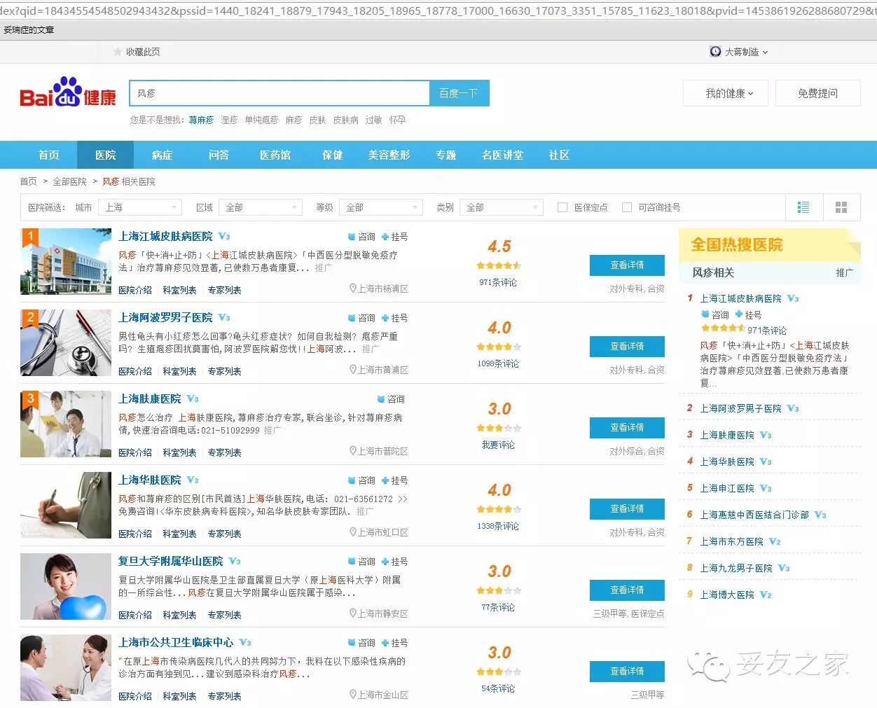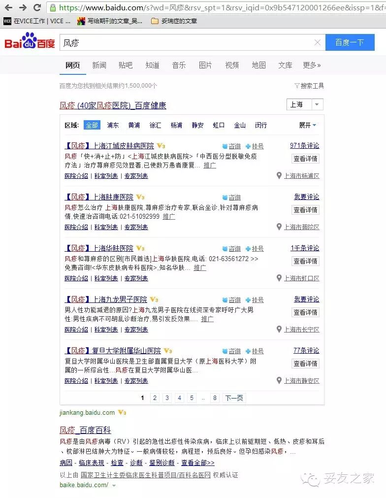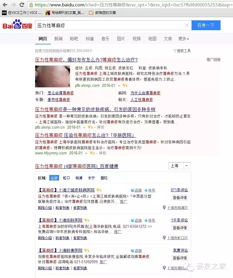然而在百度搜索“风疹”,得到的是这些东西。都是先要告诉你得了风疹必须要去各种医院去挂专家号,要去花钱吃药才可以治愈。而关于风疹最常见的两个种类之一的压力性风疹在第一个页面没有找到。