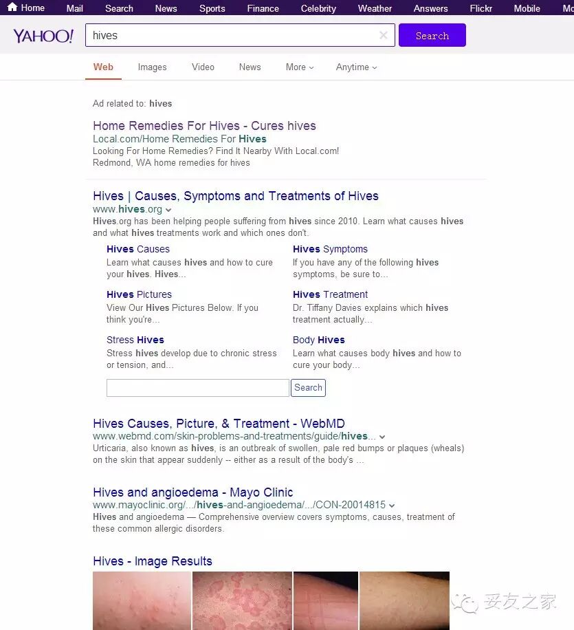 我们另一端的yahoo,我打出风疹的英文”hives”,搜索结果则告诉我是这样的。