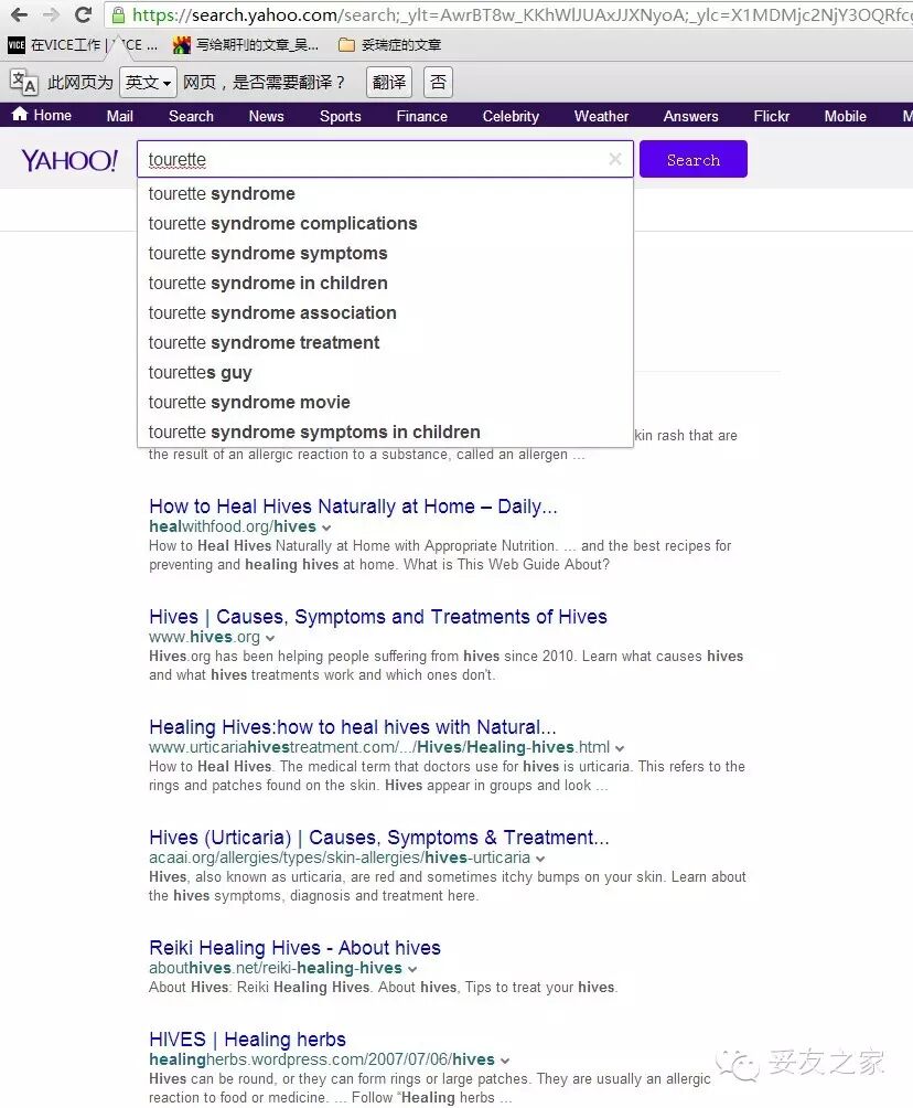 在yahoo英文网站的搜素框里输入妥瑞氏症的英文“Tourette