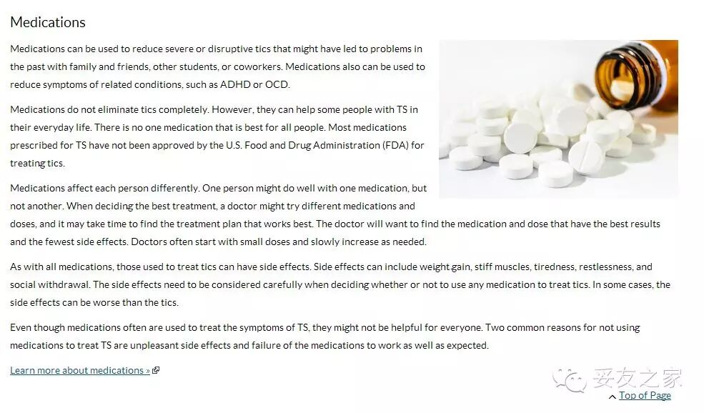 在介绍药物的段落中,CDC在其中明确指出,“没有一种药可以完美的适合所有的患者,药物只能用于减轻极为严重或有破坏性的抽动症状,并对妥瑞并发症有适当缓解作用。绝大多数针对妥瑞症的处方药物都尚未被美国食品药品监督管理局(FDA)批准作为治疗抽动的药剂使用。”