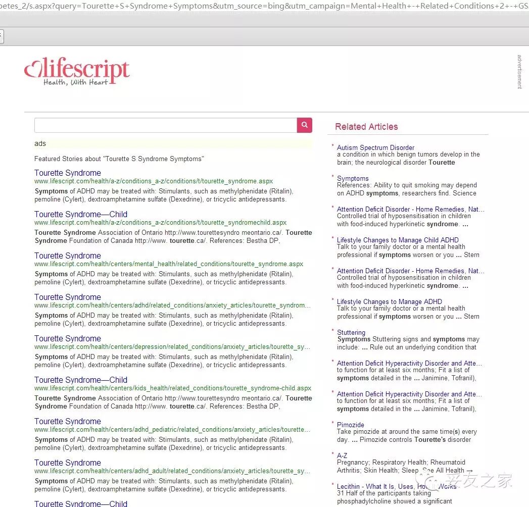 广告收入是任何商业网站生存手段之一。但大蒋发现yahoo的第一个广告网站点进去并不是某些医院的官网,而是一个与生命健康资讯有关的搜索网站关于妥瑞症的列表。
