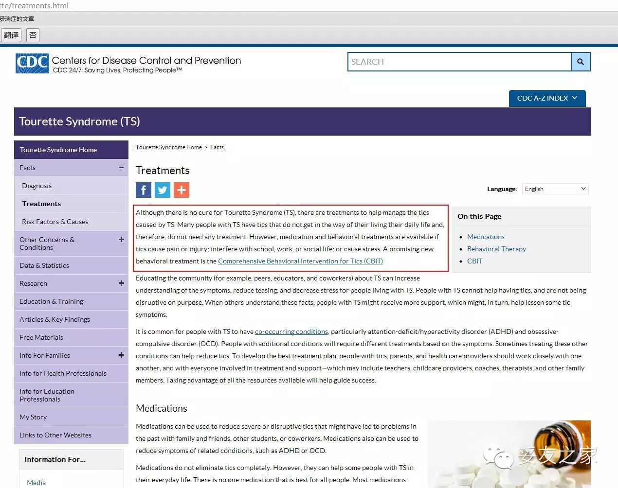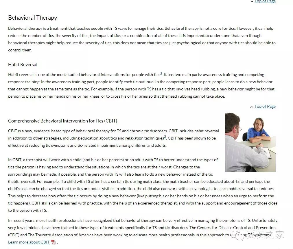 这里大蒋仅拿出其中美国权威的医疗机构“全美疾病控制防疫中心”(以下简称CDC)的关于妥瑞氏症治疗的页面来告诉你,国外的权威是如何看待妥瑞症的。http://www.cdc.gov/ncbddd/tourette/treatments.html