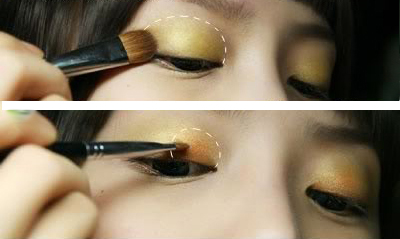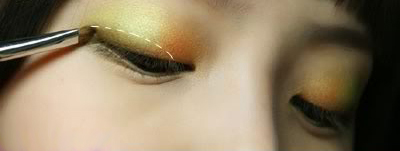 2、在眼头约1/3处用小眼影刷沾取橙黄色沿着眼线处慢慢向上晕染,并与周围的底色均匀过渡;