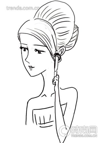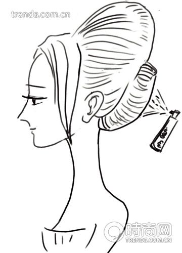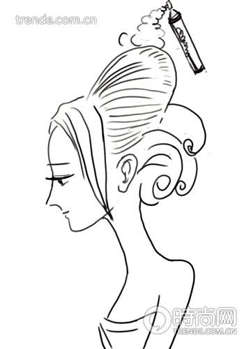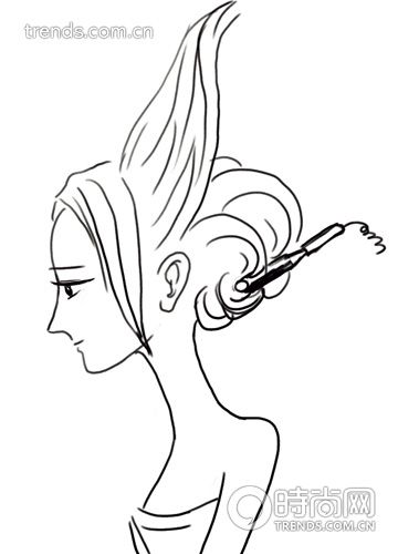 3.在定点处放一个小发包,以便将头发高高垫起,然后用顶部头发包住发包,用摩丝定型。