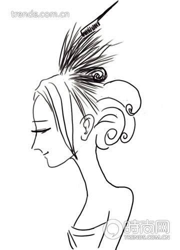 2.在头顶处做一个小发卷,作为顶部盘发的定点,并用梳子将其他部分打毛。
