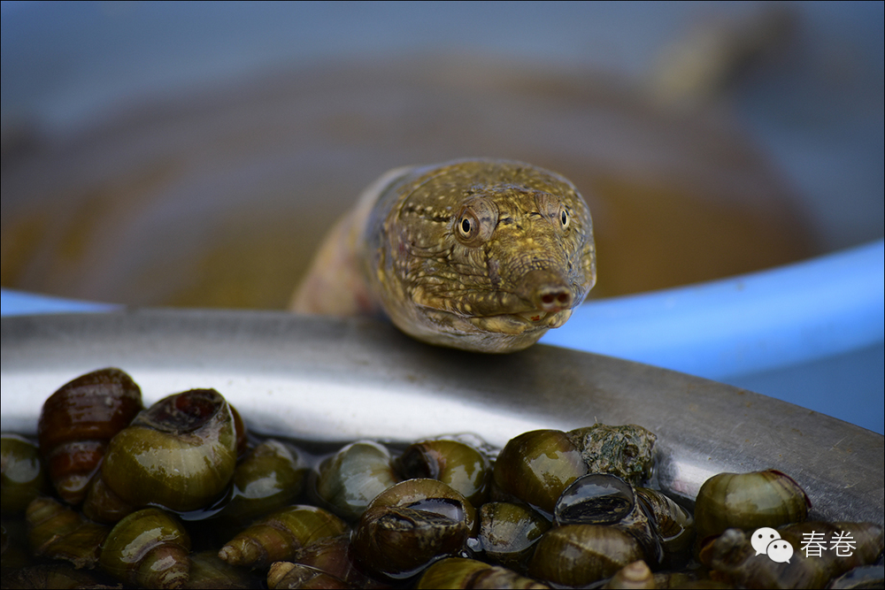 水产摊上的这只甲鱼似乎很觊觎旁边的螺蛳?