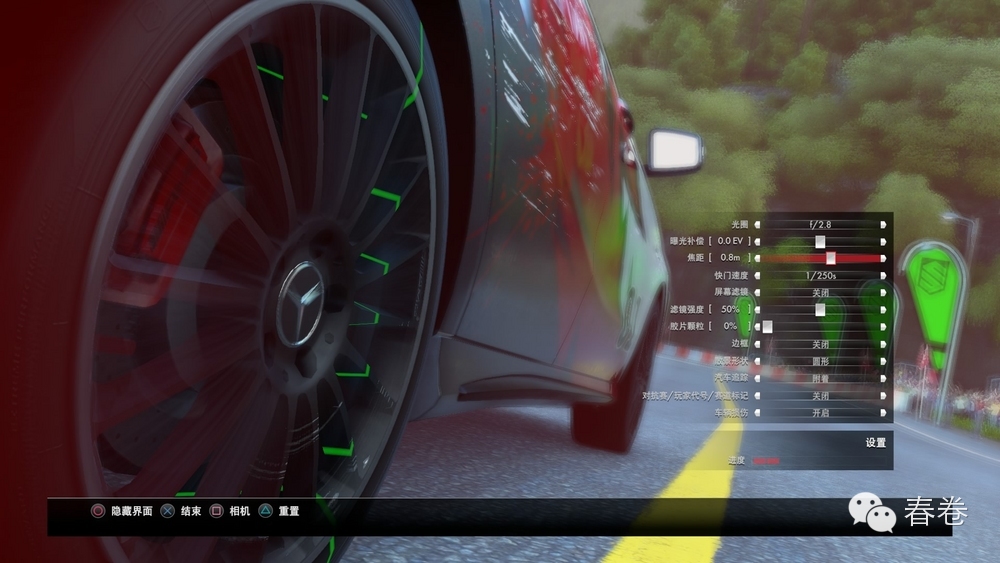 游戏的拍照菜单有诸多专业选项,画面中轮毂处的绿色为峰值对焦显示