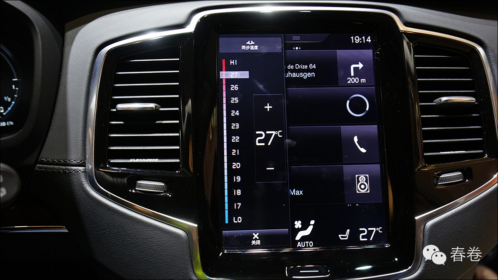 另外,沃尔沃方面并没有因为全新XC90的这块智能触控屏幕面积广大而在一个屏幕上堆砌太多信息。事实上,除了顶部只起状态显示用的那些图标较小外,其他所有允许用户进行触控操作的菜单、按键都被预留了足够大的面积以确保用户不会误触。我尝试着在模拟驾车的情况下仅用余光观察屏幕并调整空调的温度,发现只需要在屏幕底部显示的温度区域点击并拖动即可,非常快捷。