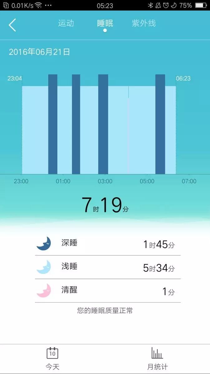 它可以对我的午睡、深度睡眠、浅睡眠和清醒等进行精准区分。其中深度睡眠是指用户大脑皮层处于良好的休息状态;而浅睡眠期间,用户往往会有翻身等轻微的动作。利用这一功能,我还可以设置智能闹钟,这样荣耀手环就会根据我的睡眠状况,来智能的进行唤醒。