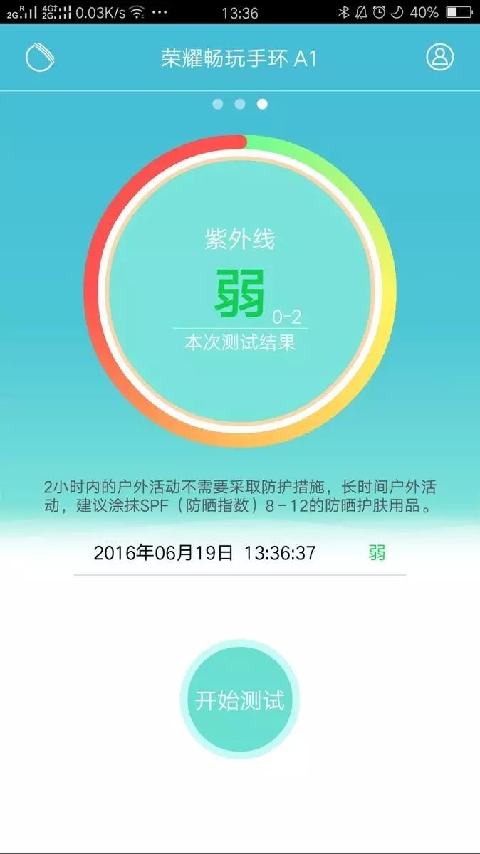 这个时候,这款手环带有的紫外线检测功能就相当有用了。我只要先选择自己所佩戴手环腕带的材质,并在出门前把手环正面对着太阳光,手环就会自动进行检测当前户外的紫外线水平,为我的健康保驾护航