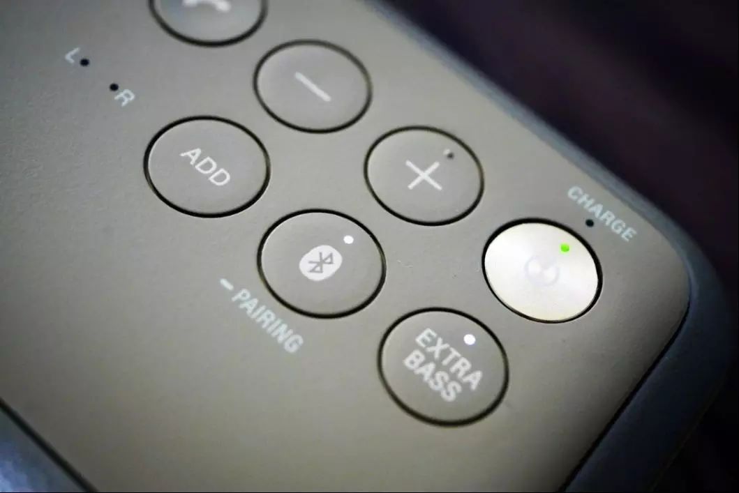 XB3机身顶部一共有七个物理按键,包括同心圆拉丝金属电源键、音量控制按键、电话接听键、Extra Bass功能键、蓝牙配对键以及声道配对键。其中电源键、蓝牙配对键和Extra Bass键上面均有一个工作状态指示灯,而蓝牙配对键键下方还有一个配对状态指示灯。透过这些指示灯,这些按键的工作状态能够非常清晰的显示出来。