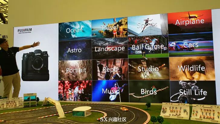 在今天发布会上,富士实际也展示了一张由许多不同种类摄影类型构成的“拼图”。他们对于自己之前产品的定位是能够很好的完成诸如风光、肖像、街拍、旅行之类的摄影类型,但受限于机能以及系统不完整(缺少强悍的外闪系统)而无法应对类似体育、赛车、航空航天、野生动物或者需要无线引闪的室内景物/工作室拍摄等。但随着新机身X-T2以及全新的无线闪光系统的出现,这些类型的摄影主题也可以使用富士X系列相机完成了。