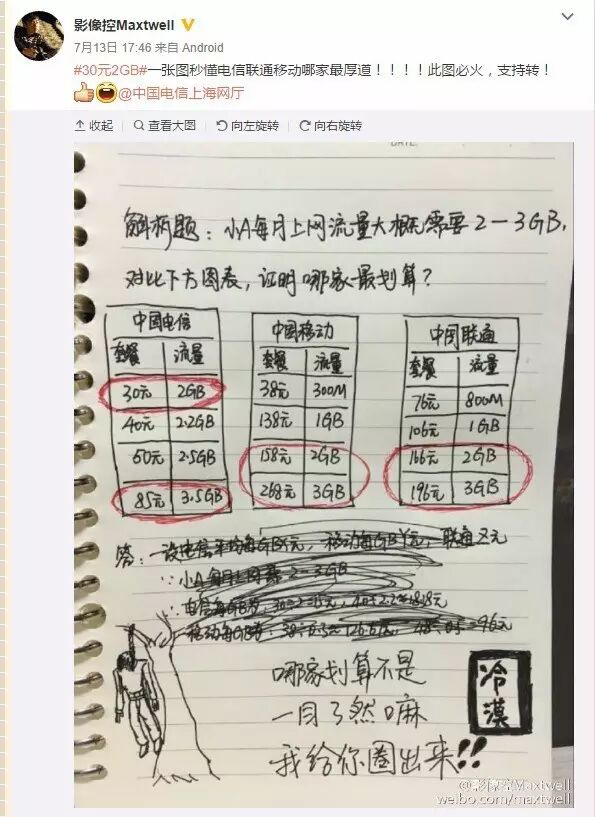 听说我前几天刚刚去移动营业厅多花60块钱把原来每月2GB流量提升到4GB,好友@影像控Maxtwell 后悔的连着拍大腿对我说:卷哥,我刚好想要给你安利一下我们电信的新资费政策,就晚了一步啊!