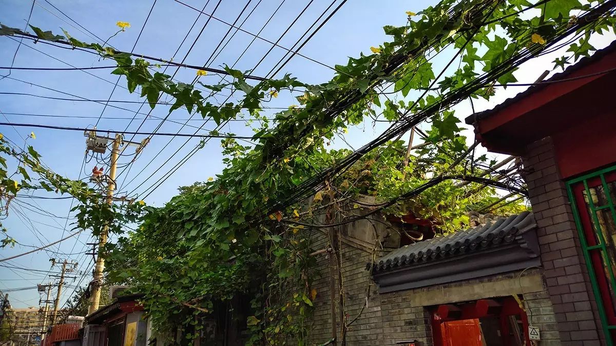 我特别喜爱北京胡同里的那种市井气息,感觉就连那些杂乱缠绕在电线上的各色爬山虎和牵牛花都显得生气勃勃。在这种光线环境中,我不需要对手机做太多调整,直接把天机7设置在自动模式下,最多用手指在屏幕上稍稍调节一下曝光补偿就能获得一张曝光准确、层次感分明的街头纪实照片。