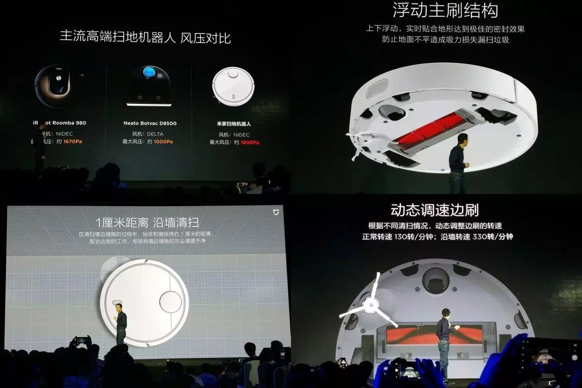 再比如小米特别使用一页ppt展示的浮动主刷结构同样并不算新鲜,但其宣称风压达到超越进口同行的1800pa是否真的能吸起更多杂物,这也需要通过对比试验来证明。此外,虽然用手机app来远程遥控/监视扫地的功能并不新鲜,但米家扫地机器人宣称能紧贴墙壁1cm进行彻底清扫、单刷能够根据距离墙面位置调整转速的设计还是相当值得称道的。